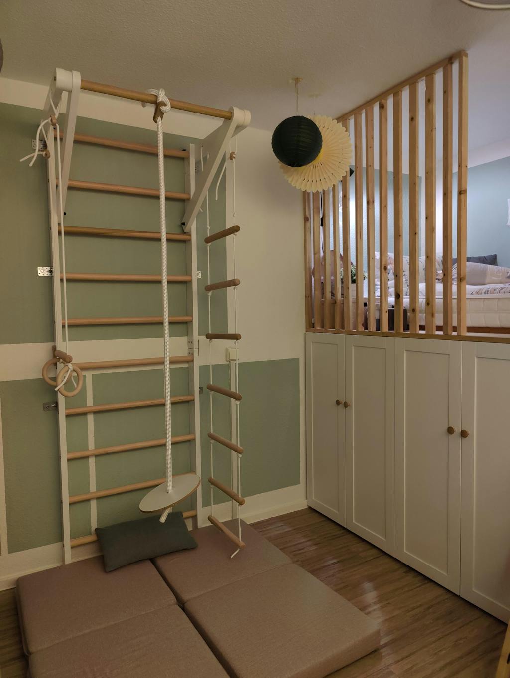 Integrierte Sprossenwand, höhenverstellbares Wandreck, Kletterseil und Gymnastikringe – perfekt für Heimtraining